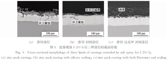 (2)滲鋅涂層的腐蝕形式主要為應力腐蝕,即 腐蝕介質通過應力產(chǎn)生的裂紋直接進入涂層中,腐 蝕產(chǎn)物又使裂紋進一步擴展,如此往復,造成涂層的 嚴重腐蝕;滲鋅-封閉涂層中,封閉層的腐蝕主要表 現(xiàn)為點蝕和全面腐蝕并存的形式,點蝕坑可直達滲 鋅層,使?jié)B鋅層發(fā)生應力腐蝕,全面腐蝕使封閉層厚 度明顯減?。粷B鋅-達克羅-封閉涂層的耐蝕性優(yōu)異, 但封閉層存在剝離現(xiàn)象,可能對耐蝕性產(chǎn)生影響。
